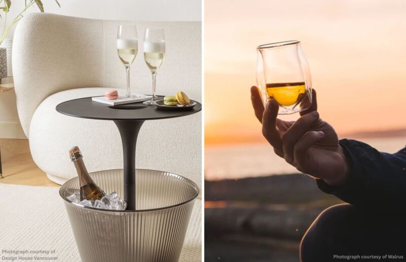 The perfect mix of beauty and function: the Alessi Pick-Up Side Table with built-in bottle container available at Design House Vancouver plus the Norlan Whisky Glass  available at Walrus. A sculptural table that keeps drinks ready; a glass engineered for the perfect pour. Together, they turn everyday hosting into a design moment.